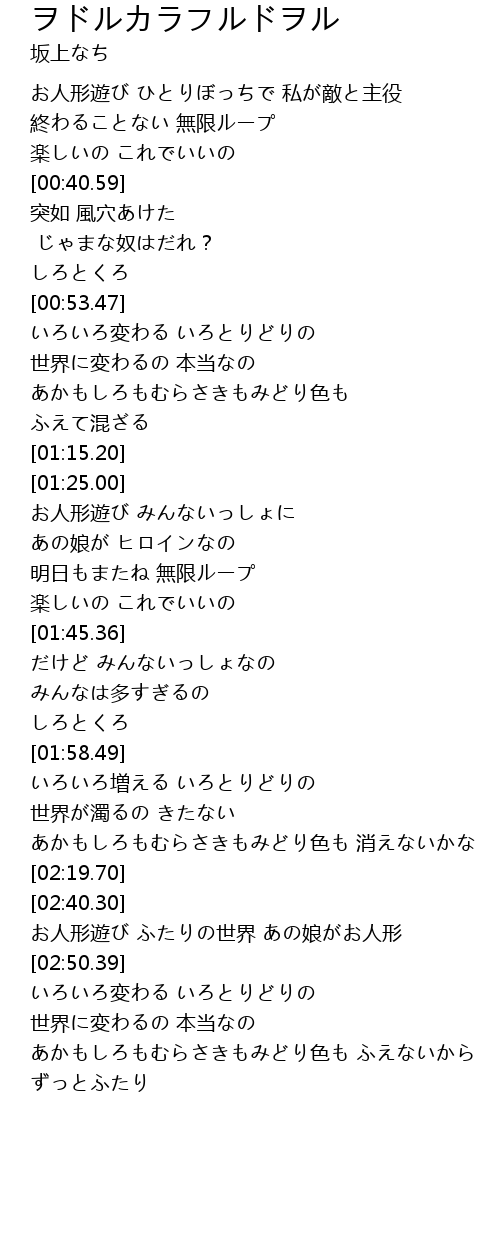 | [00:20.74] | お人形遊び ひとりぼっちで 私が敵と主役 |