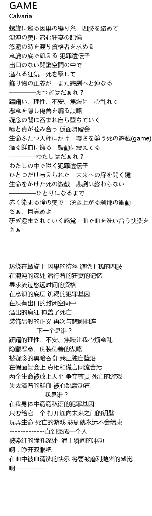 | [01:54] | 生命ふたつ天秤にかけ 尊さを競う死の遊戯(game) |