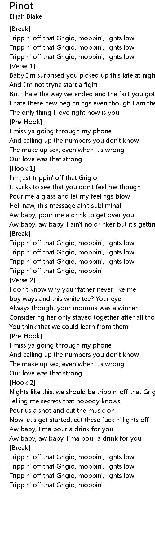 Trippin' off that Grigio, mobbin', lights low |