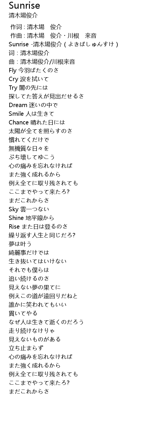 | [00:00.00] | Sunrise -清木場俊介(よきばしゅんすけ) |