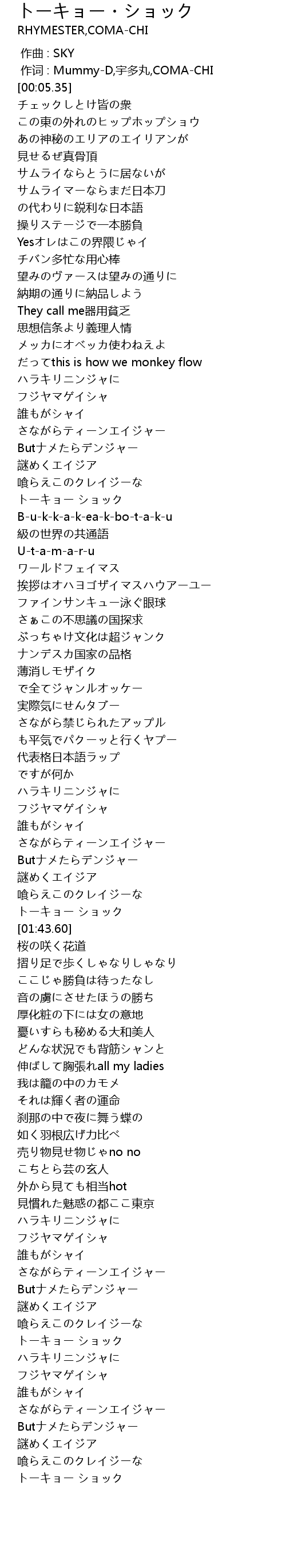 | [00:01.00] | 作词 : Mummy-D,宇多丸,COMA-CHI |