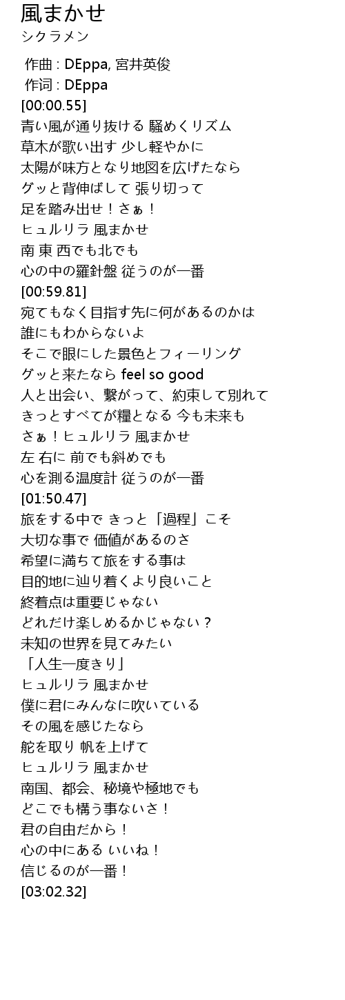 | [01:36.80] | さぁ!ヒュルリラ 風まかせ |