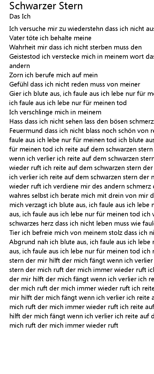| Feuermund dass ich nicht blass noch sch n von reden muss ich blute aus, ich faule aus ich lebe nur fü r meinen tod ich blute aus, ich faule aus ich lebe nur fü r meinen tod ich reite auf dem schwarzen stern der mir hilft der mich f ngt wenn ich verlier ich reite auf dem schwarzen stern der mich ruft der mich immer wieder ruft ich reite auf dem schwarzen stern der mir hilft der mich f ngt wenn ich verlier ich reite auf dem schwarzen stern der mich ruft der mich immer wieder ruft ich verdiene mir des andern schmerz dass ich nicht zeigen muss mein wahres selbst ich berate mich mit drein von mir dass ich nicht h ren muss was mich verzagt ich blute aus, ich faule aus ich lebe nur fü r meinen tod ich blute aus, ich faule aus ich lebe nur fü r meinen tod ich verkü nde heut mein schwarzes herz dass ich nicht leben muss wie faulend | |