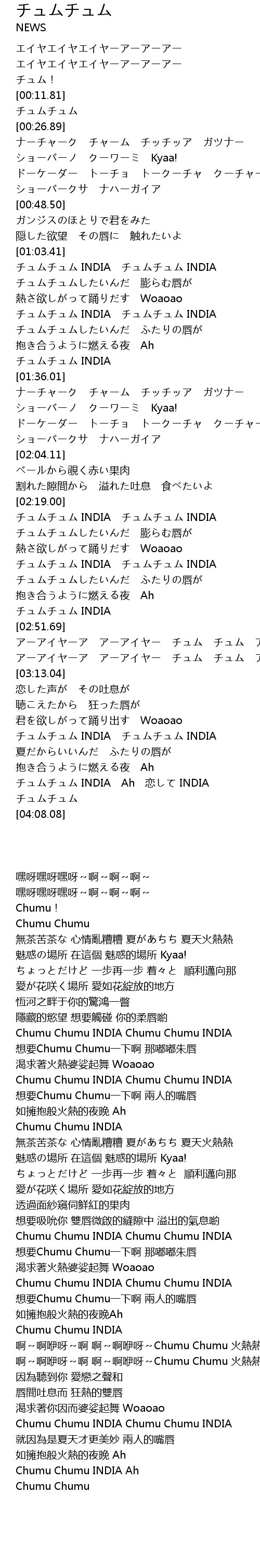 | [03:43.48] | チュムチュム INDIA Ah 恋して INDIA |