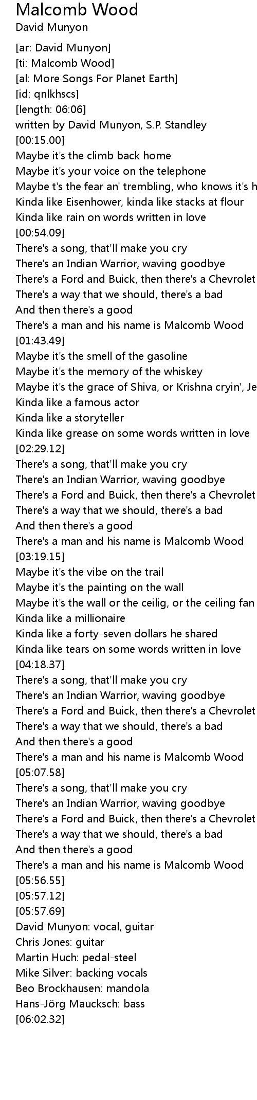 | [03:12.77] | There' s a man and his name is Malcomb Wood |