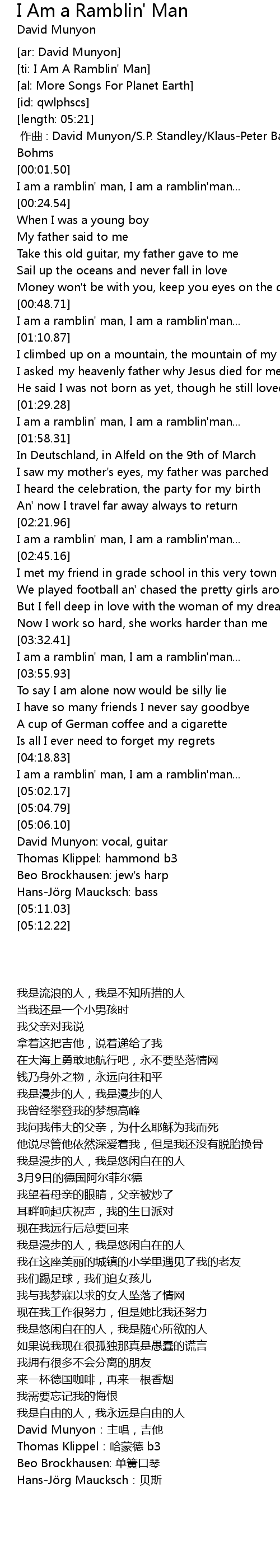 | [00:03.65] | I am a ramblin' man, I am a ramblin' man... |