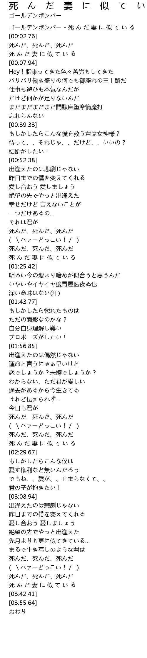 | [00:00.17] | ゴールデンボンバー - 死 ん だ 妻 に 似 て い る |