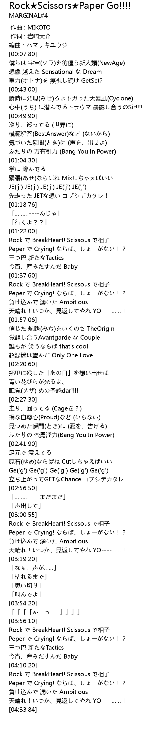 | [04:11.16] | Rock で BreakHeart! Scissous で相子 |