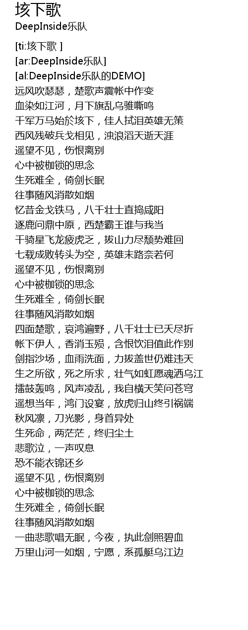 | [00:58.74] | 血染如江河,月下旗乱乌骓嘶鸣 |