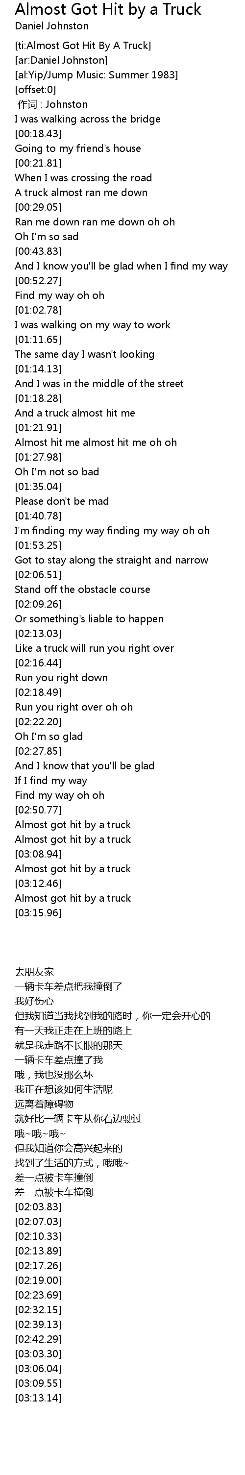 | [01:22.84] | Almost hit me almost hit me oh oh |