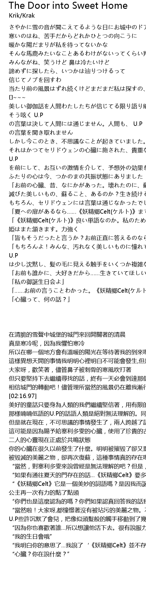 | [04:19.97] | 「夏への扉があるなら……《妖精郷Celt(ケルト)》までは何マイルくらいかしら?きっと辿りつけるわ!」 |