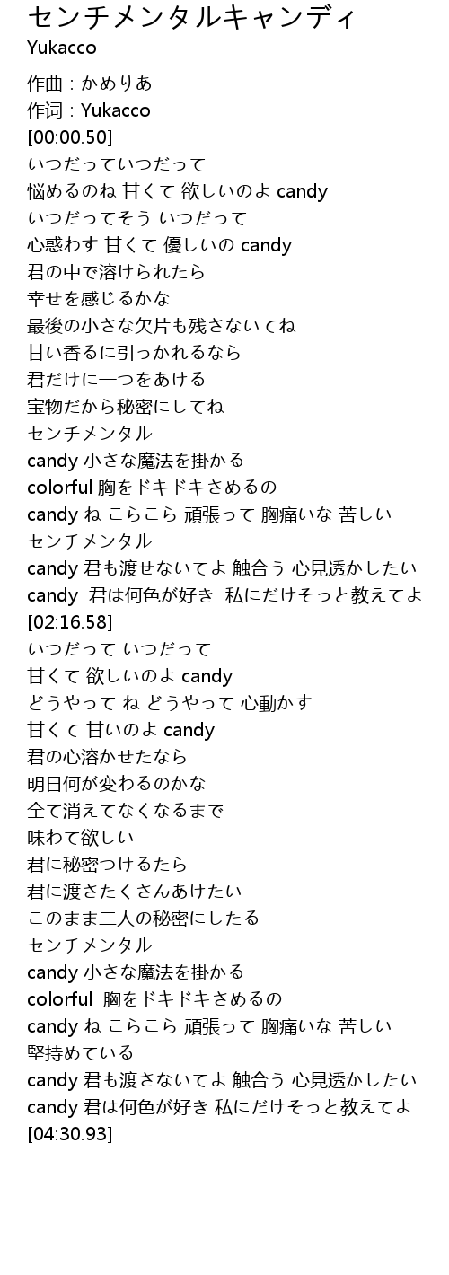 | [04:11.96] | candy 君も渡さないてよ 触合う 心見透かしたい |