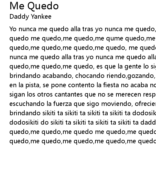 Yo nunca me quedo alla tras yo nunca me quedo, me quedo,me quedo,me quedo,me quedo me quedo,me quedo,me qume quedo,me quedo,me quedo, me quedo,me quedo,me quedo,me quedo,me quedo,me quedo, me quedo,me quedo,me quedo,hey!!!!!!!!! yo nunca me quedo alla tras yo nunca me quedo alla tras yo nunca me quedo,me quedo,me quedo,me quedo, es que la gente lo sigue mirando el estilo que sigue brindando acabando, chocando riendo,gozando, bailando sonido que mueve la gente en la pista, se pone contento la fiesta no acaba no tengo la mente, no kiero que sigan los otros cantantes que no se merecen respeto yo creo que puedo seguir escuchando la fuerza que sigo moviendo, ofreciendo yo tengo el estilo que sigue brindando sikiti ta sikiti ta sikiti ta sikiti ta dodosikiti do dodosikiti do dodosikiti do sikiti ta sikiti ta sikiti ta sikiti ta daddy yankee me quedo,me quedo,me quedo,me quedo me quedo,me quedo,me qume quedo,me quedo,me quedo, me quedo,me quedo,me quedo,me quedo,me quedo,me quedo |