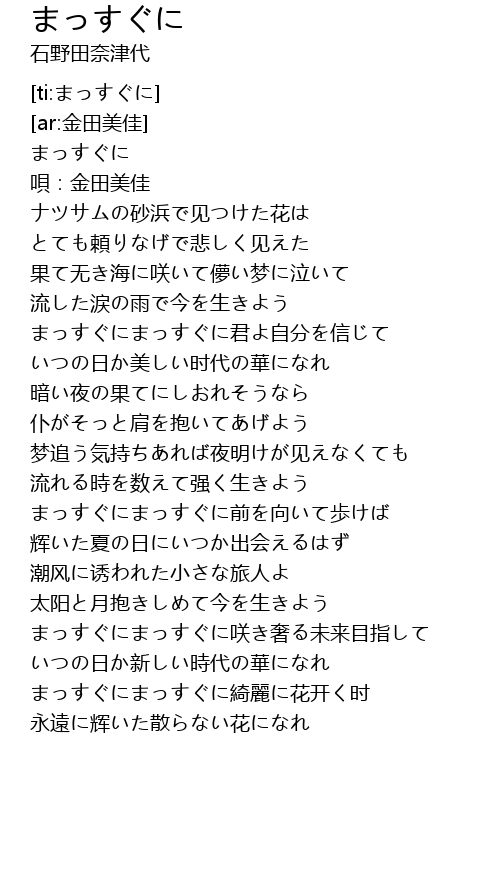 | [01:06.580] | まっすぐにまっすぐに君よ自分を信じて |