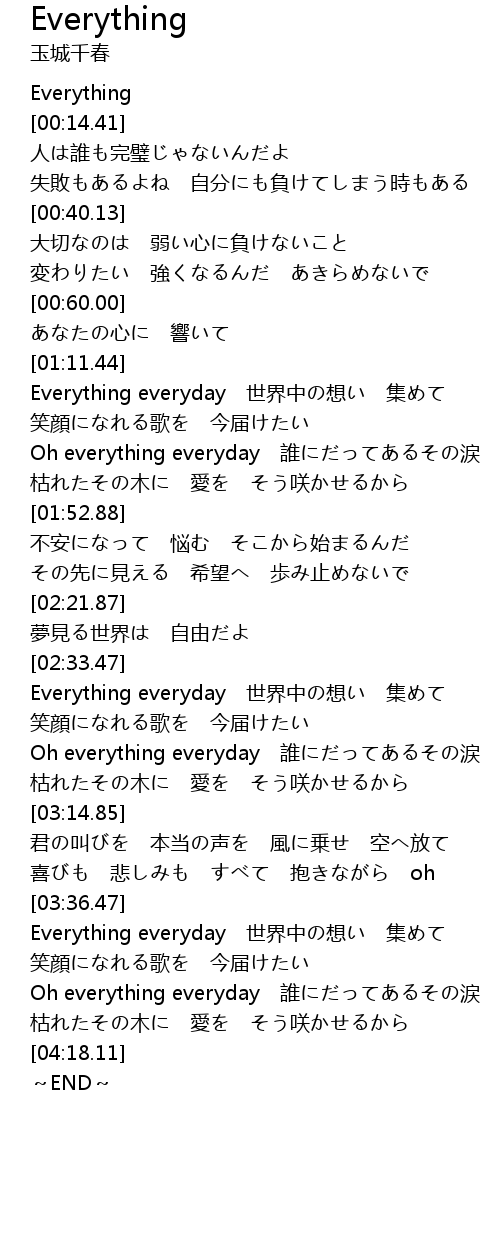 | [01:12.44] | Everything everyday 世界中の想い 集めて |