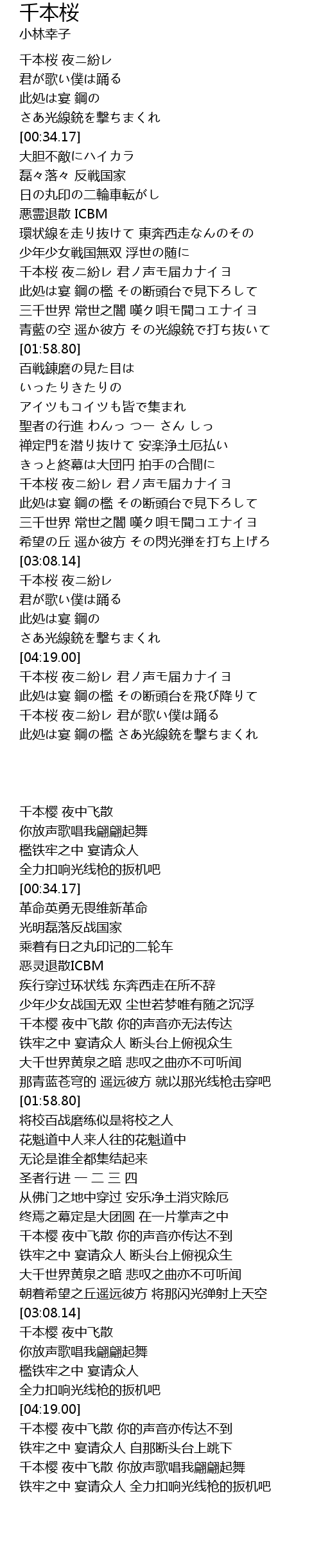 | [02:34.17] | 千本桜 夜ニ紛レ 君ノ声モ届カナイヨ |