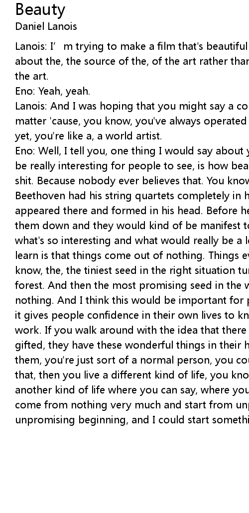 | Lanois: I' m trying to make a film that' s beautiful in itself, about beauty, about the, the source of the, of the art rather than everything that surrounds the art. | |