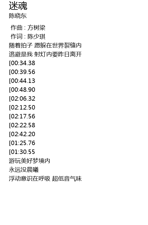| [03:13.42][02:22.58][01:11.70] | 身心轻飘迷魂 |