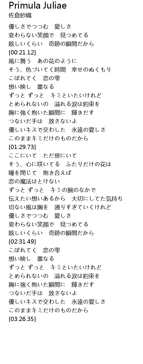 | [01:38.92] | そう、心に咲いてる ふたりだけの花は |