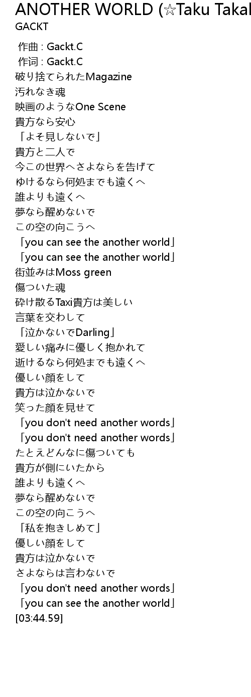 | [00:01.00] | 作词 : Gackt.C |