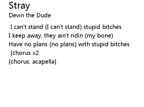 | I tend to stray from stupid bitches [break] [chorus x2] [break] [chorus x3] [chorus: acapella] |