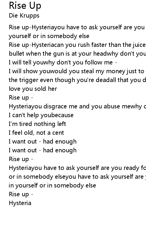 Rise up-Hysteriayou have to ask yourself are you ready for thisis the faith in yourself or in somebody else |