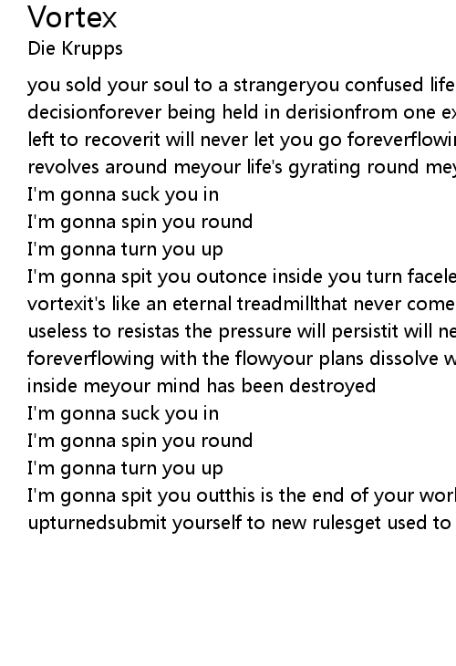 I'm gonna spit you outonce inside you turn facelessyou become part of the vortexit's like an eternal treadmillthat never comes to a standstilland it is useless to resistas the pressure will persistit will never let you go foreverflowing with the flowyour plans dissolve without meyou lose your dreams inside meyour mind has been destroyed |