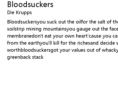 | Bloodsuckersyou suck out the oilfor the salt of the earthyou ravage the soilstrip mining mountainsyou gauge out the faceyou suffocate lifein an asphalt membranedon't eat your own heart'cause you can never winbloodsuckersyou steal from the earthyou'll kill for the richesand decide what it's worthbloodsuckersgot your values out of whackyou've been selling your soulfor a greenback stack |