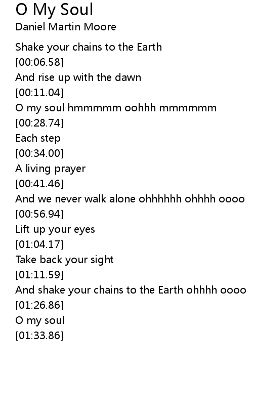 | [00:14.10] | O my soul hmmmmm oohhh mmmmmm |