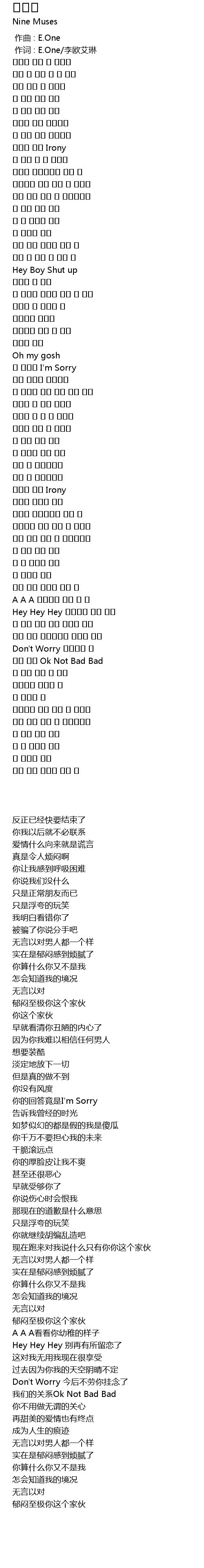 | [00:01.00] | 作词 : E.One/李欧艾琳 |