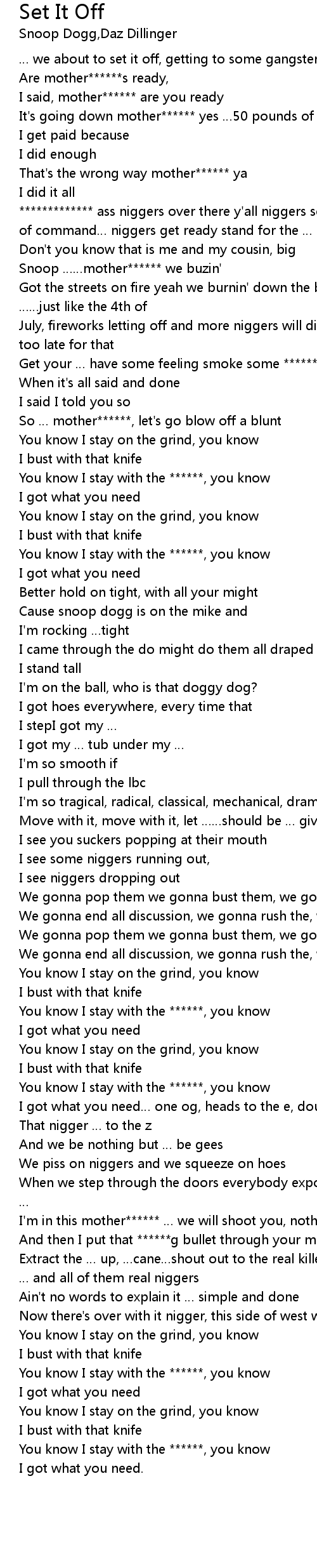 | Extract the … up, …cane…shout out to the real killers, **** dealers and … and all of them real niggers | |