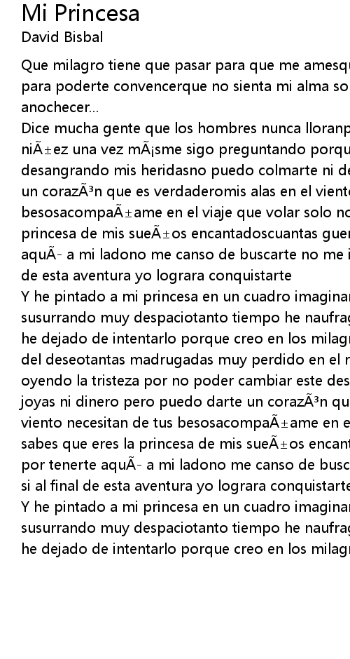 | Y he pintado a mi princesa en un cuadro imaginariole cantaba en el oido susurrando muy despaciotanto tiempo he naufragado y yo se que no fue en vanono he dejado de intentarlo porque creo en los milagrossigo caminando en el desierto del deseotantas madrugadas muy perdido en el recuerdopidiendo el desespero oyendo la tristeza por no poder cambiar este destinono puedo colmarte ni de joyas ni dinero pero puedo darte un coraz n que es verdaderomis alas en el viento necesitan de tus besosacompa ame en el viaje que volar solo no puedoy sabes que eres la princesa de mis sue os encantadoscuantas guerras he librado por tenerte aqu a mi ladono me canso de buscarte no me importara arriesgarte si al final de esta aventura yo lograra conquistarte | |