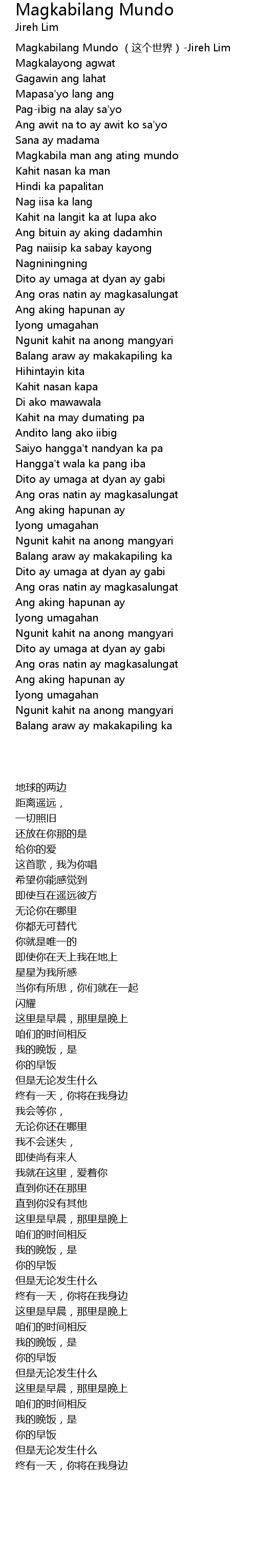 | [00:00.00] | Magkabilang Mundo (这个世界)-Jireh Lim |