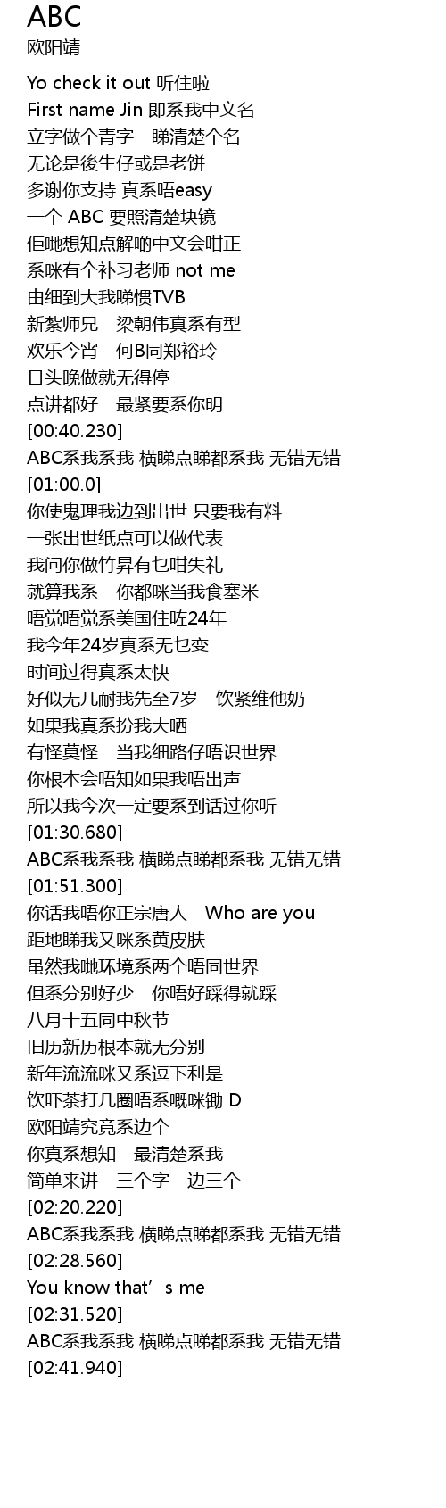 | [00:40.590] | ABC系我系我 横睇点睇都系我 无错无错 |