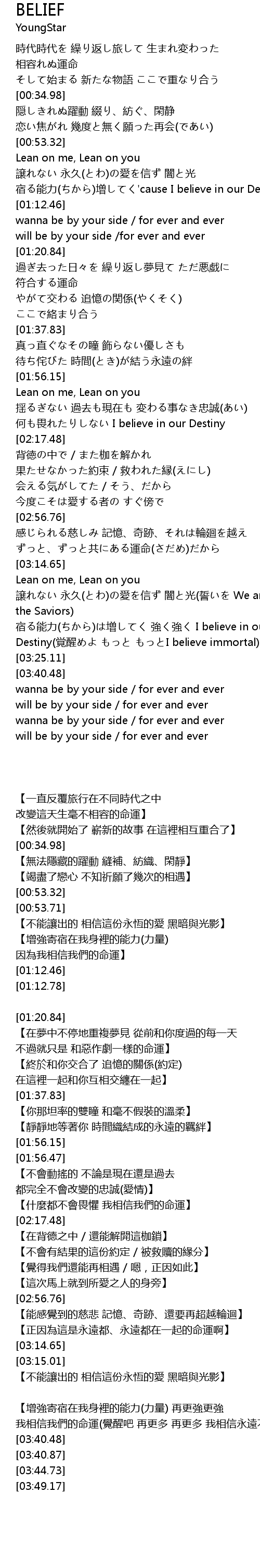 | [03:25.11] | sù néng lì zēng qiáng qiáng I believe in our Destiny jué xǐng I believe immortal |