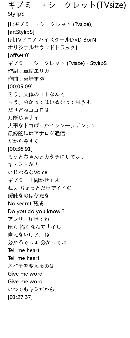 | [00:00.57] | ギブミー・シークレット (Tvsize) - StylipS |