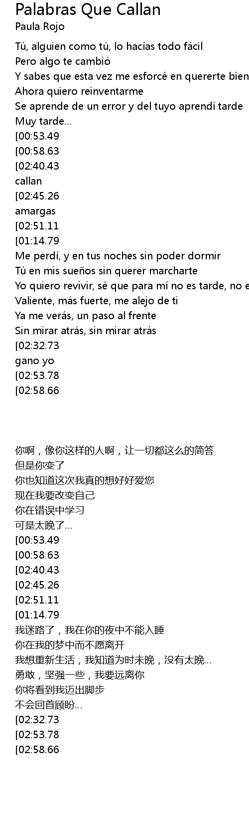 | [03:10.84][02:40.43][01:54.88][01:01.35] | Ya no quiero creer en palabras que callan |
