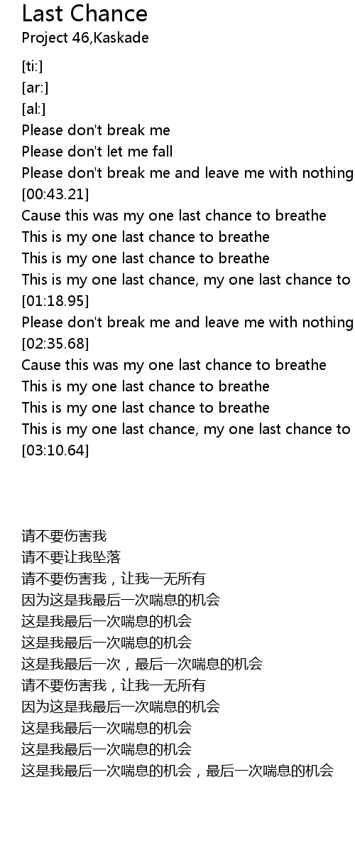 | [00:43.89] | Cause this was my one last chance to breathe |
