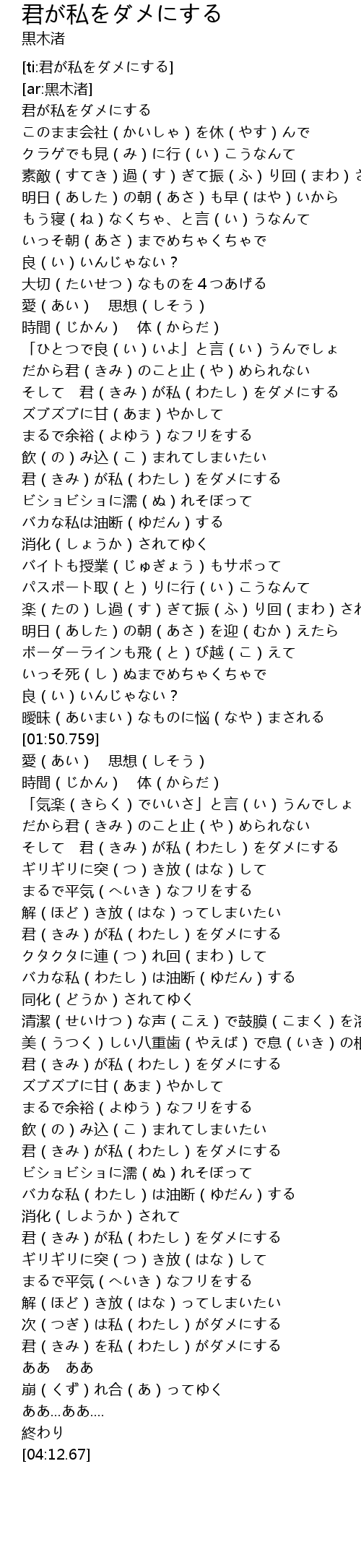 | [01:12.728] | 君(きみ)が私(わたし)をダメにする |