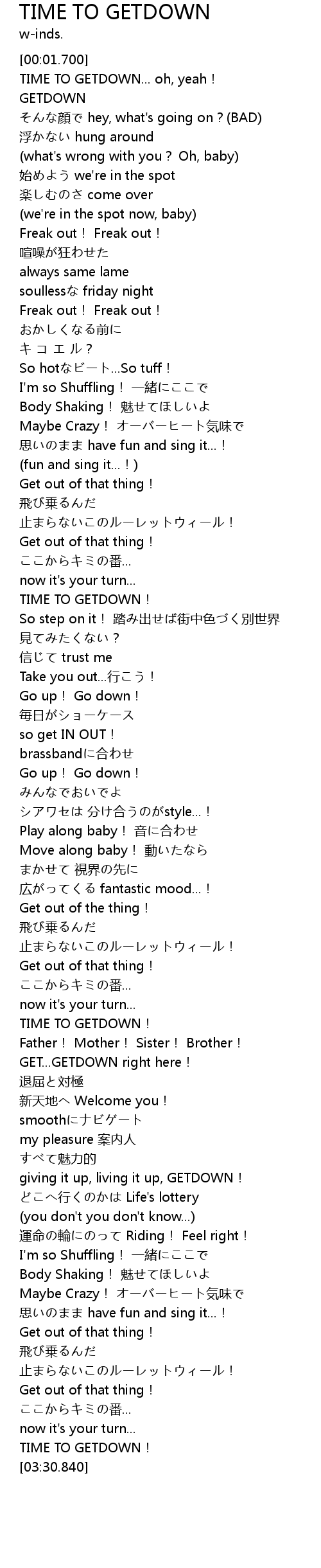 | [00:05.530] | TIME TO GETDOWN... oh, yeah! |