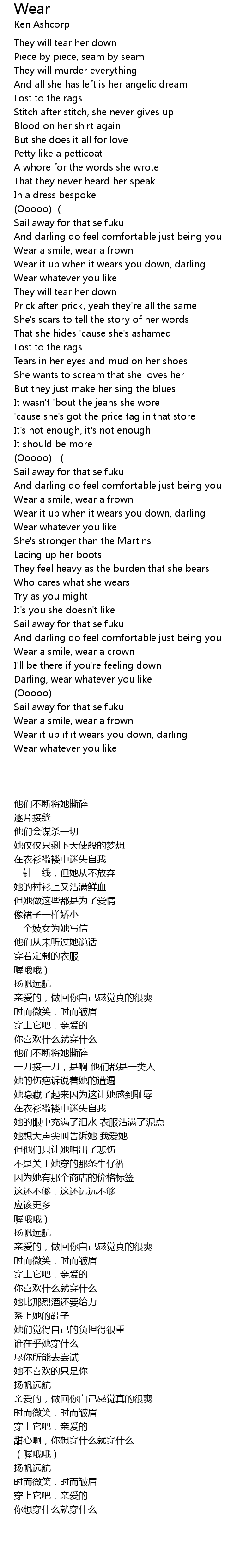 | [01:43.749] | Wear it up when it wears you down, darling |