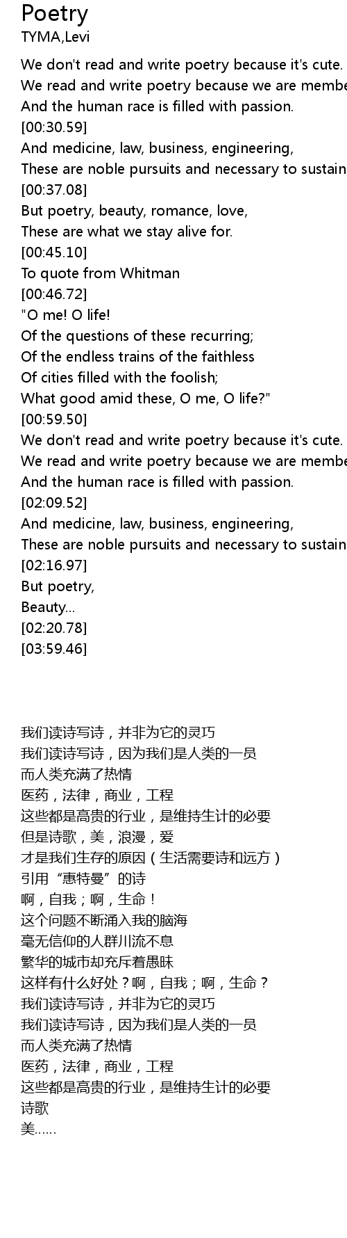 | [02:02.17] | We read and write poetry because we are members of the human race. |