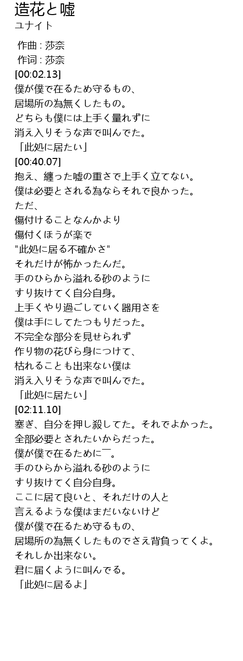 | [00:56.47] | 抱え、纏った嘘の重さで上手く立てない。 |