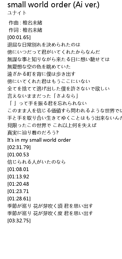 | [03:04.29][01:23.71] | It' s in my small world order |
