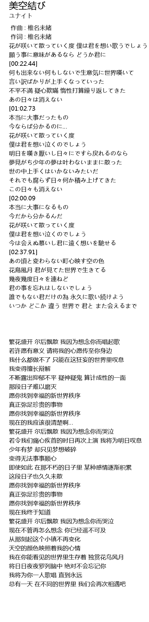 | [00:00.33] | 花が咲いて散っていく度 僕は君を想い歌うでしょう |