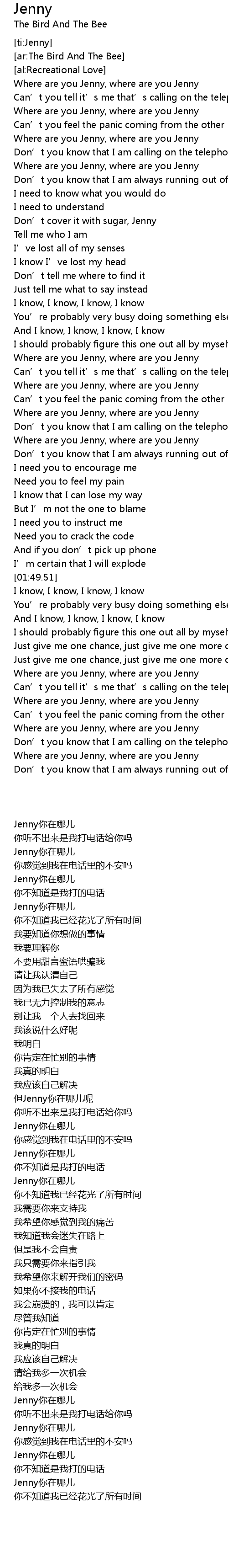 | [02:51.67] | Where are you Jenny, where are you Jenny |