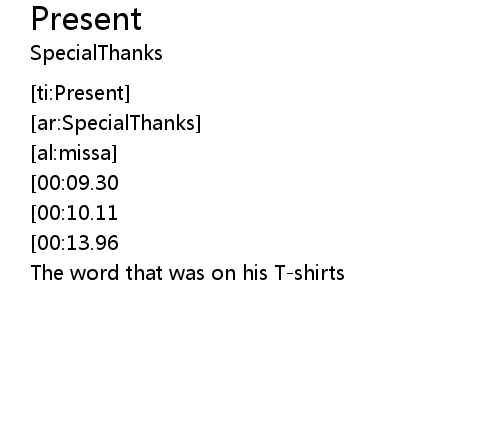 | [00:06.13][00:13.96][00:21.86] | The word that was on his T-shirt |