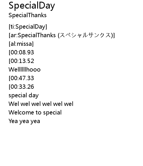 | [00:01.35][00:08.93] | Welcome to the special day |