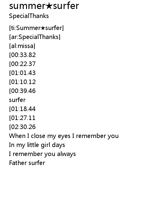 | [00:30.61][00:39.46][01:14.21][01:22.90][01:51.49][02:00.35][02:08.69][02:17.38] | Summer surfer |