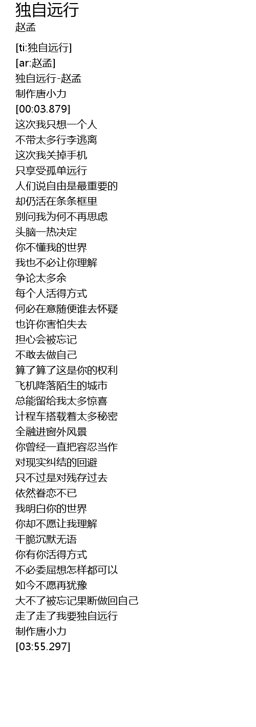 | [03:44.945] | zǒu le zǒu le wǒ yào dú zì yuǎn xíng |